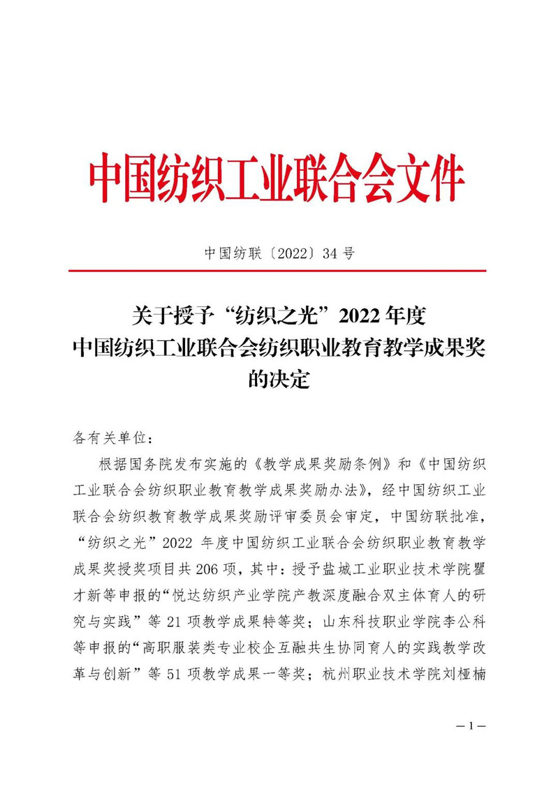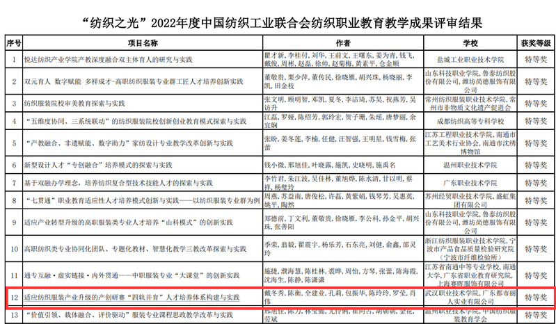 武职网讯(通讯员 汪春莲)9月6日,中国纺织工业联合会公布了“纺织之光”2022年度纺织职业教育教学成果奖获奖名单,我校纺织与服装工程学院戴冬秀、陈衡、全建业、孔莉、包振华、陈玲玲、罗莹、肖伟申报的《适应纺织服装产业升级的产创研赛“四轨并育”人才培养体系构建与实践》 项目经初评、网络评审和会议评审,荣获本届教学成果奖特等奖。